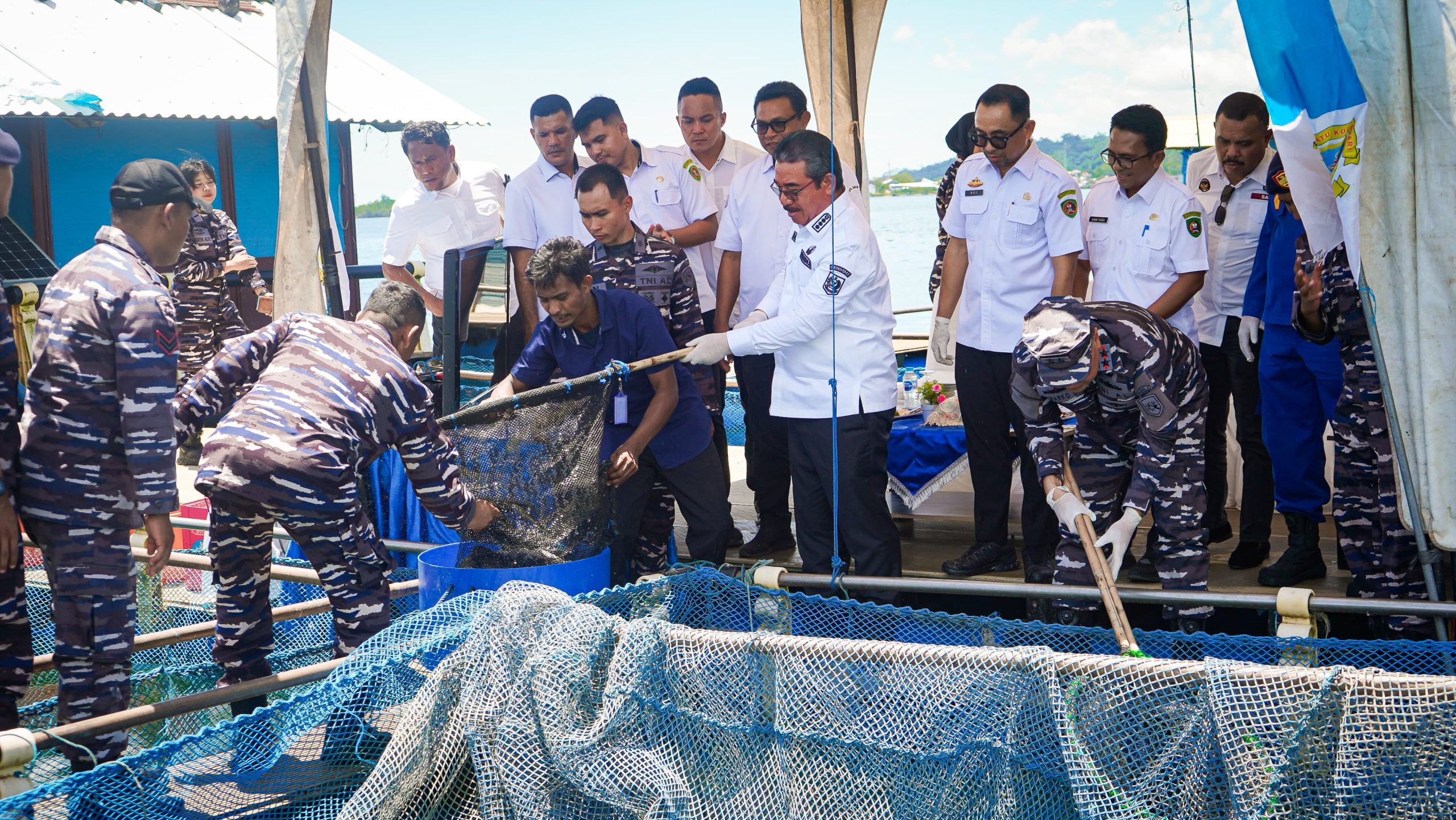 Selain kegiatan panen serempak yang dilaksanakan secara terpusat di Kabupaten Lampung Utara, Kodaeral IX bersama Forkopimda Maluku juga melaksanakan panen ikan di KJA perairan teluk Ambon.